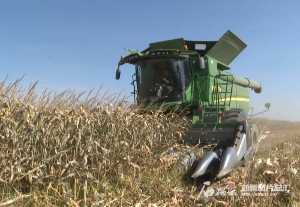 10月9日,福海县齐干吉迭乡玉米田里,联合收割机在收割玉米。福海县融媒体中心供图