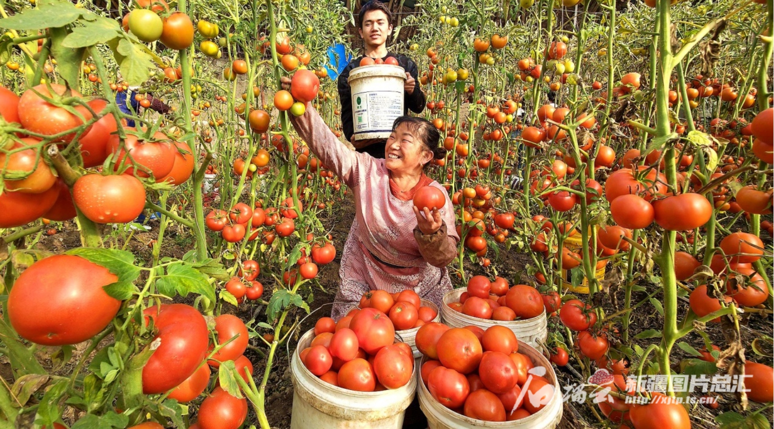 10月23日,伊犁哈萨克自治州察布查尔锡伯自治县,菜农在采摘西红柿。华岩明摄